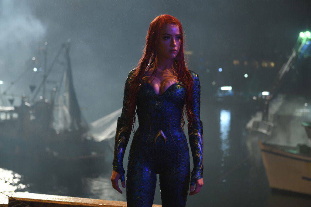 Amber Heard cannot sit down in her Aquaman costume (she plays Mera)